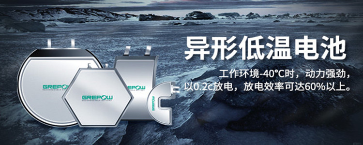 • 格瑞普異形低溫電池在工作環(huán)境-40℃時(shí),仍然動(dòng)力強(qiáng)勁,以0.2C放電,放電效率可達(dá)60%以上。